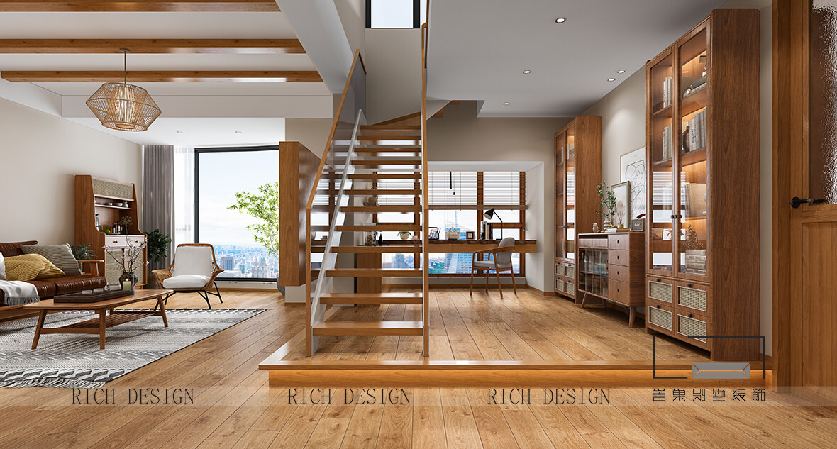 這是一套230m2頂樓復(fù)式,采用大塊面的原木色飾面板包裹住的房子,將客餐廳、臥室與書房,進(jìn)行合理分區(qū),組成一個個方形空間,仿佛置身于一個大木盒中。 客戶與設(shè)計(jì)師一致認(rèn)為,簡單、隨興與自在,便是生活最美的樣子,而日式原木恰巧能滿足客戶內(nèi)心對生活的期望。